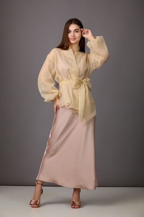 Комплект, состоящий из блузы и платья-комбинации. Прозрачная блуза из вуали  немного расширена к низу, с планкой по горловине и бортам.  Рукава-балон. Завязывается на пояс. Платье-комбинация из плотного атласа. Крой выполнен по косой, что обеспечит великолепную посадку на фигуре. Бретели  регулируемые.