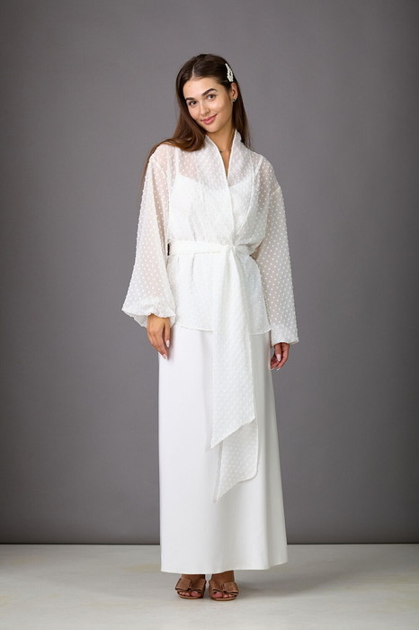 Комплект, состоящий из блузы и платья-комбинации. Прозрачная блуза из вуали  немного расширена к низу, с планкой по горловине и бортам.  Рукава-балон. Завязывается на пояс. Платье-комбинация из плотного атласа. Крой выполнен по косой, что обеспечит великолепную посадку на фигуре. Бретели  регулируемые.