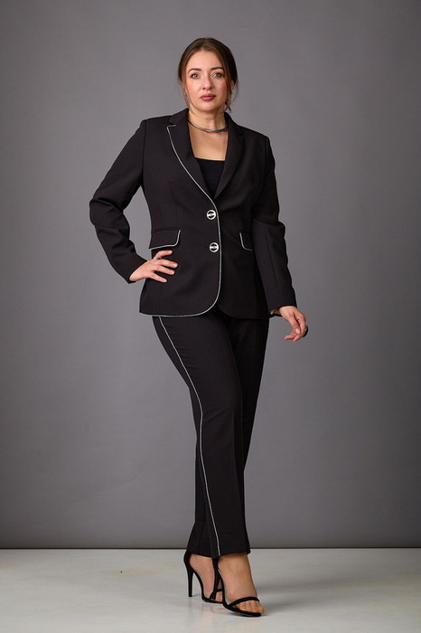 Брючный костюм из костюмной ткани на подкладке. Жакет приталенного силуэта с прорезными карманами с клапанами по переду. Воротник-английский, рукава - двухшовные. Застегивается на две пуговицы. Брюки слегка заужены к низу, с поясом. Посадка- средняя. Застегиваются на молнию по переду и одну пуговицу. Серебряный кант по краю борта, клапанам и боковым швам брюк добавит стиля и элегантности.