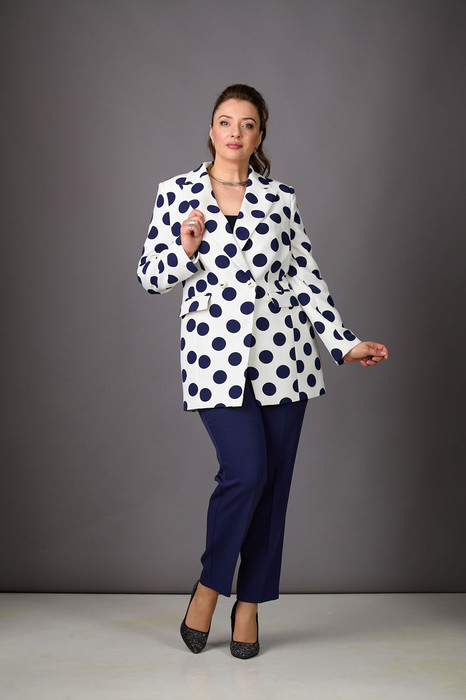 Романтика и стильная женственность - горохи снова в тренде! Эффектный комплект из стрейчевой костюмной ткани на подкладке, состоящий из жакета и брюк. Жакет приталенного силуэта с карманами с клапанами по переду. Воротник с лацканами пиджачного типа, рукава - втачные, длинные. Застежка на пуговицы. Брюки со средней посадкой, зауженные к низу, с карманами и регулируемым резинкой поясом. Застегиваются на молнию и пуговицу.