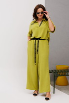 Брючный комплект из костюмной ткани на подкладке.  Жакет с расширенной линией плеч, с отрезными бочками по переду и спинке и вытачками по переду. Воротник-с отложными лацканами пиджачного типа. По переду - прорезные  карманы  с клапанами. Рукава длинные, двухшовные. Жакет застегивается на три пуговицы. Брюки прямые со складкой, широким поясом-обтачкой, наклонными карманами. Застегиваются на молнию по переду  и пуговицу.