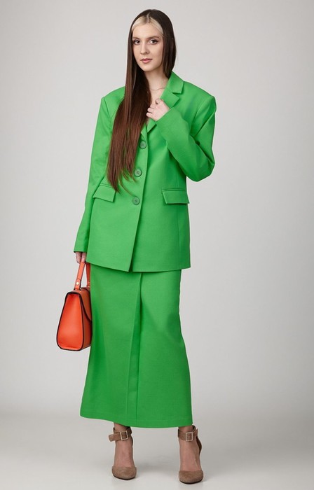 Комплект, состоящий из жакета и юбки, из джинсовой ткани на подкладке. Жакет с расширенной линией плеч, с отрезными бочками по переду и спинке и вытачками по переду. Воротник-с отложными лацканами пиджачного типа. По переду - прорезные карманы с клапанами. Рукава длинные, двухшовные. Жакет застегивается на три пуговицы. Юбка- миди с наклонными карманами и складкой по переду, с широким поясом-обтачкой. Застегиваются на молнию спереди и пуговицу.
