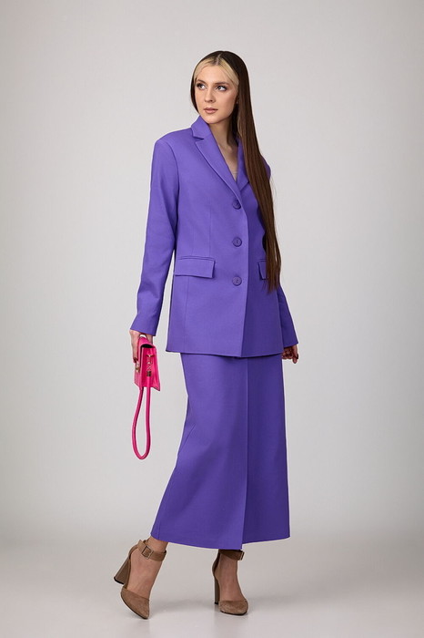 Комплект, состоящий из жакета и юбки, из джинсовой ткани на подкладке. Жакет с расширенной линией плеч, с отрезными бочками по переду и спинке и вытачками по переду. Воротник-с отложными лацканами пиджачного типа. По переду - прорезные карманы с клапанами. Рукава длинные, двухшовные. Жакет застегивается на три пуговицы. Юбка- миди с наклонными карманами и складкой по переду, с широким поясом-обтачкой. Застегиваются на молнию спереди и пуговицу.