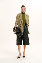 Двубортный жакет выполнен в стиле оверсайз.  Воротник-с отложными лацканами пиджачного типа, рукава – двухшовные. Карманы в боковых швах. Жакет имеет  два ряда пуговиц, застегивается на две основные пуговицы, одну потайную, остальные пуговицы несут декоративный характер.