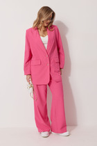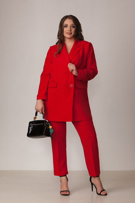Брючный комплект из костюмной ткани на подкладке. Двубортный жакет выполнен в стиле оверсайз.  Воротник-с отложными лацканами пиджачного типа, рукава – двухшовные. По переду-прорезные карманы  с клапанами. Жакет  застегивается на две основные пуговицы и одну потайную.  Брюки слегка заужены к низу, с двумя наклонными карманами и поясом.  Застегиваются на молнию по переду и  одну пуговицу.