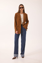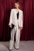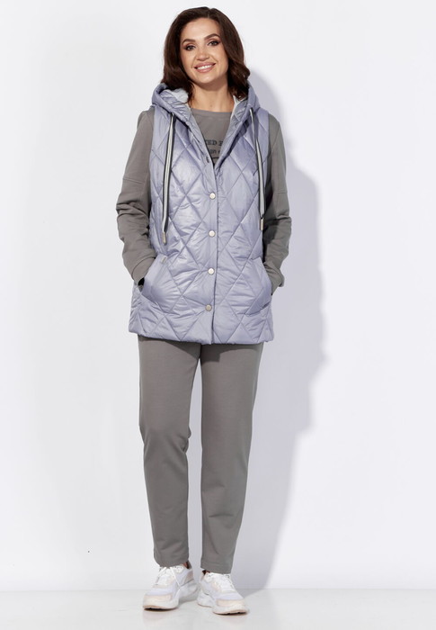 Комплект женский, 3х предметный, состоящий из жилета, свитшота и брюк. Жилет выполнен из плащевой ткани, стеганой на синтепоне, на подкладке. По переду прорезные карманы с листочкой. Застежка центральная на кнопки. Горловина оформлена капюшоном с кулисой по краю. Спинка без особенностей. Свитшот прямого силуэта с длинным, втачным рукавом. Рукав с рельефами и декоративной заплаткой на локте. По низу манжета. Перед задекорирован вышивкой. Вырез горловины круглой формы с подрезной бейкой. По спинке горизонтальный подрез. Брюки прямые, длинные. Спереди наклонные карманы. Пояс притачной, с резинкой по кругу и декоративной кулисой.