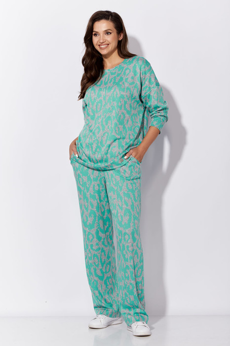 Комплект женский, 2х предметный, состоящий из джемпера и брюк. Джемпер прямого силуэта с длинным рукавом . Рукав со спущенной линией плеча. Вырез горловины круглой формы с подрезной бейкой. По низу переда декоративная нишивка. Брюки прямые с наклонными карманами спереди. Пояс притачной с резинкой.
