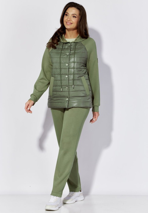 Комплект женский, 2х предметный, состоящий из куртки и брюк. Куртка прямого силуэта, с длинным рукавом. , покроя "реглан" По низу рукава притачная манжета. Перед и спинка выполнены из плащевки, стеганой на синтепоне, на подкладке. Спереди карманы и центральная застежка на кнопки. Горловина оформлена капюшоном с кулисой по краю. На рукаве отделочная нашивка. Брюки прямые, с карманами в боковых швах. Сзади, снизу небольшие разрезы в подрезной детали и отделочная нашивка. Пояс притачной, с резинкой по кругу.
