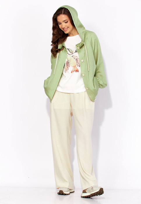 Куртка-парка, облегченная, без подкладки, прямого силуэта. Рукав реглан, длинный, по низу на резинке. Горловина оформлена капюшоном с кулисой. По переду карманы в рельефах. Застежка центральная, потайная, на петли и пуговицы. Низ куртки регулируется кулисой с фиксатором по бокам. Спинка без особенностей.