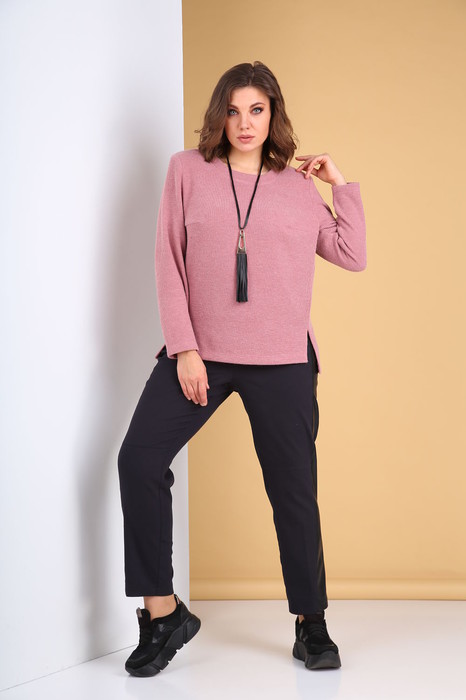 Джемпер свободного кроя выполнен из мягкого, приятного к телу трикотажа , с разрезами и удлинённой спинкой. На переде обработаны нагрудные вытачки. Рукав длинный, втачной. Брюки прямые, выполнены из стрейчевого джинса и экокожи. На передних половинках брюк обработаны внутренние карманы и поперечные швы над уровнем колена, на задних половинках кокетки. Притачной пояс брюк с пуговицей и с резинками в районе боковых швов.