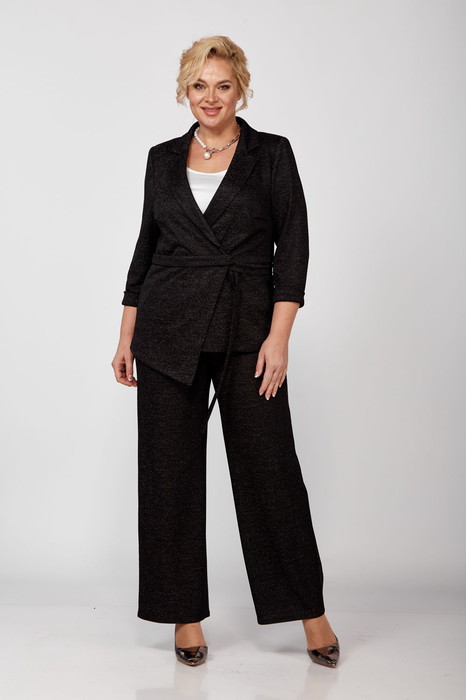 Жакет со съёмным поясом, прямого силуэта. Полочки с нагрудными вытачками, отрезные по линии талии. Низ полочек ассиметричный. Спинка со средним швом. Рукав втачной, длиной 7/8, по низу обработан манжетой. Застёжка двубортная на две петли и пуговицы. Горловина оформлена отрезными лацканами и воротником.