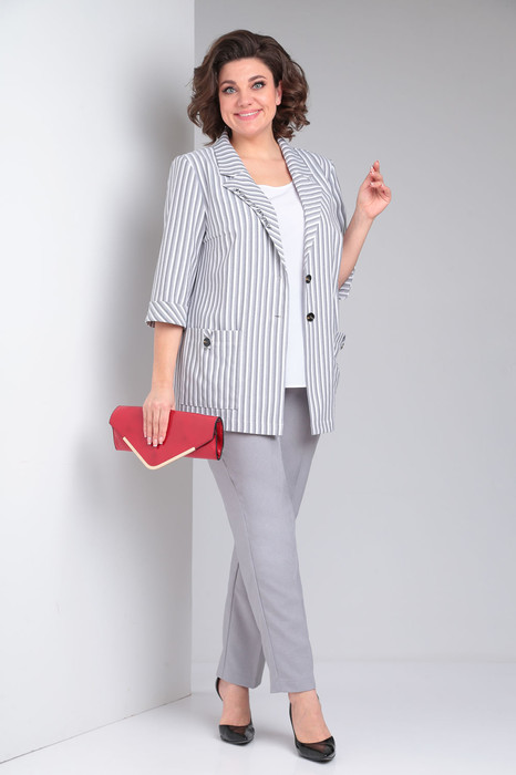 Комплект женский трёхпредметный, состоящий из жакета, брюк и блузы, отлично подойдет как для работы в офисе, так и для свободного времени. Жакет полуприлегающего силуэта с центральной бортовой застёжкой на две петли и пуговицы. На переде обработаны нагрудные вытачки, накладные карманы на уровне бёдер. Стильным акцентом служит печатный принт на лацкане. Спинка со средним швом. В боковых швах обработаны разрезы. Рукав втачной, длиной 3/4, с отложной манжетой. Горловина обработана английским воротником. Брюки прямые, слегка зауженные к низу, на притачном поясе с пуговицей и с резинками в районе боковых швов. На передних половинках обработаны функциональные карманы. Блуза с нагрудными вытачками, без рукавов. Горловина округлой формы. В боковых швах обработаны разрезы. Фурнитура может отличаться от представленной на фото.