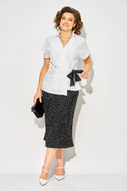 Комплект женский двухпредметный, состоящий из жакета и брюк, отлично подойдет как для работы, так и для повседневной жизни. Жакет прямого силуэта с центральной бортовой застёжкой на две петли и пуговицы. На переде обработаны нагрудные вытачки, накладные карманы на уровне бёдер. Спинка со средним швом. В боковых швах обработаны разрезы. Рукав втачной, длиной 3/4, с отложной манжетой. Горловина обработана английским воротником. Брюки прямые, слегка зауженные к низу, на притачном поясе с пуговицей и с резинками в районе боковых швов. На передних половинках обработаны функциональные карманы. Фурнитура может незначительно отличаться от представленной на фото.