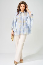 Брюки на притачном поясе с резинкой и имитацией гульфика. Передние половинки с функциональными карманами. Лёгкая блуза с коротким рукавом. Перед с нагрудными вытачками и дизайнерским принтом. Горловина обработана окантовкой. В боковых швах обработаны разрезы.