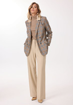 Брюки прямые, на притачном поясе с пуговицей и резинками в районе боковых швов. На передних половинках обработаны функциональные внутренние карманы. На задних половинках обработаны вытачки.
