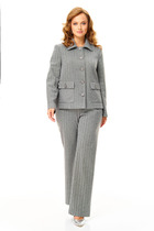 Элегантный костюм-тройка, состоящий из жакета, футболки и брюк. Жакет и брюки выполнены из костюмной ткани, футболка — из трикотажного полотна. Жакет прямого силуэта, с застежкой на две петли и две пуговицы. Перед жакета с нагрудной вытачкой, с прорезными карманами в рамку с клапаном. Спинка жакета со средним швом, заканчивающийся шлицей, левая часть спинки с прорезным карманом в рамку, вход в который фиксирует навесная петля с пуговицей. Рукава двухшовные втачные. Горловина оформлена воротником пиджачного типа. Белая футболка прямого силуэта со спущенной линией плеча и втачным рукавом. Горловина обработана трикотажной бейкой из основной ткани. Брюки классической формы, прямого силуэта, со стрелками по передним и задним половинкам. Верхний срез обработан обтачным поясом. На задних половинках расположены талиевые вытачки, с декоративными листочками. В боковых швах брюк - наклонные карманы. Застёжка центральная на тесьму молнию и крючок.
