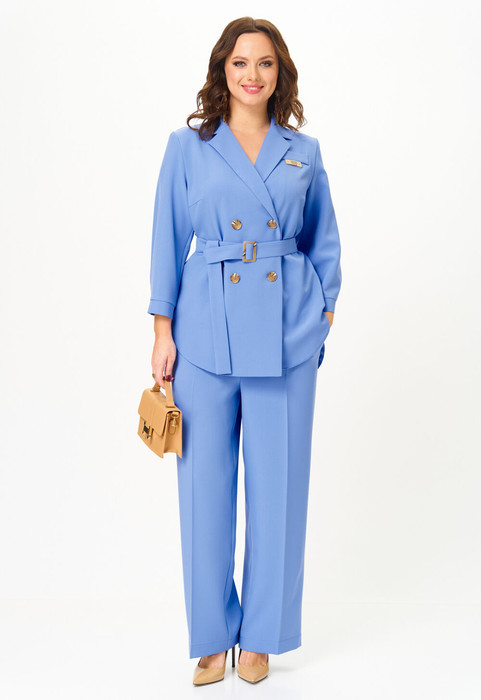 Костюм состоит из жакета и брюк. Качественная поливискоза, из которой выполнена модель, обеспечит долговечность изделию и приятные ощущения его обладательнице. Жакет без подкладки прямого силуэта, с двубортной застежкой на петли-пуговицы, длиной до середины бедра. Перед жакета с нагрудными вытачками, в области груди расположена декоративная листочка. Спинка с двойной кокеткой, в шве притачивания которой обработана встречная складка. Низ жакета фигурный, с закруглениями по боковым швам. Рукава двушовные, длиной  3/4, по низу с манжетой, застегивающейся на петлю и пуговицу. Горловина оформлена воротником пиджачного типа.  Брюки классической формы, прямые от линии бедер, со стрелками по передним и задним половинкам. Верхний срез обработан поясом, в который от бокового шва вставлена резинка по задним половинкам. В боковых швах обработаны наклонные карманы. На задних половинках расположены талиевые вытачки. В комплект входит пояс из основной ткани.
