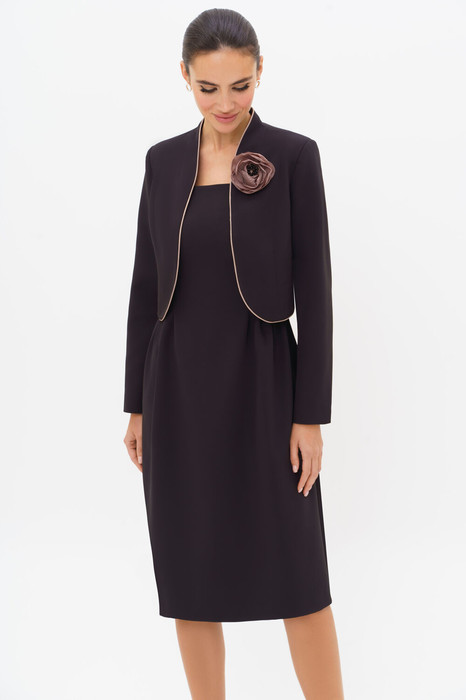 Стильный женский костюм с платьем в черном цвете со съёмным цветком ручной работы. Этот элегантный и модный комплект станет вашим незаменимым помощником в создании неповторимых и запоминающихся образов. Костюм женский 2-х предметный, состоящий из жакета и платья, выполненных из костюмно-плательной ткани.
