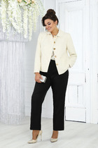 46:Жакет. Длина по среднему шву спинки - 55,0 см (±2,0 см), длина рукава - 60,5 см (±1,5 см), Ширина на уровне глубины проймы - 48,0 см (±1,0 см), Ширина на уровне линии талии - 43,0 см (±1,0 см), Ширина рукава вверху -17,5см (±1,0 см), Ширина рукава внизу - 13,0 см (±0,5 см), Длина плеча - 11,5 см (±0,5 см). Юбка Длина юбки по среднему шву - 68,0 см (±2,0 см), Ширина на уровне линии талии - 37,5 см (±1,0 см), Ширина на уровне линии бедер - 59,0 см (±1,0 см), Ширина по низу - 62,0 см (±1,0 см), Ширина пояса - 3,0 см.