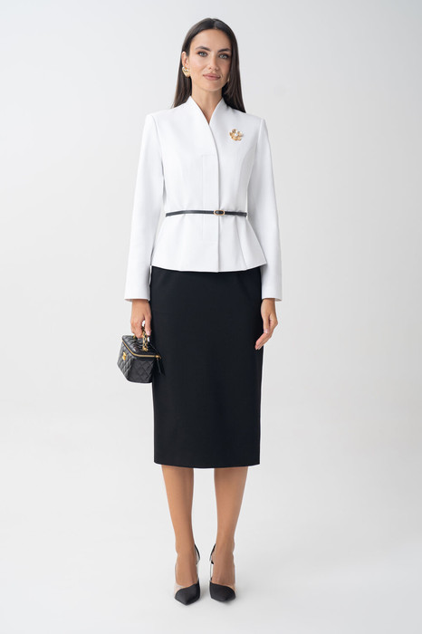 Юбка зауженная к низу, на притачном поясе, застегивающимся на 1 петлю и пуговицу. Переднее полотнище с рельефными швами. Заднее полотнище с талиевыми вытачками, со средним швом, в верхней части которого обработана застежка на потайную тесьму-молнию, в нижней – шлица. Юбка на притачной по низу подкладке.  В размерах 50,52,54 в поясе на уровне боковых швов предусмотрены резинки, для лучшего прилегания по талии. Средняя длина жакета  по среднему шву спинки 58,0 см, (±2,0 см);