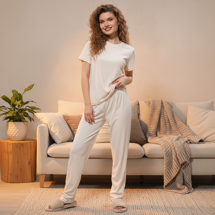 Брюки – длинные, свободного покроя, с эластичной тесьмой по талии.
