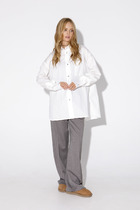 Костюм женский двухпредметный, состоящий из жакета и брюк. Жакет полуприлегающего силуэта с центральной бортовой застёжкой на одну петлю-пуговицу до линии перегиба лацкана. Перед с талиевой вытачкой и прорезным карманом с листочкой с втачными концами. Спинка со средним швом. Рукав втачной двухшовный длинный. Воротник пиджачного типа. Брюки классического кроя, слегка зауженные к низу с притачным поясом с резинкой по задним половинкам брюк. Брюки с наклонным к боковому шву карманом и двумя фигурными хлестиками на одну пуговицу по поясу передних половинок. Застёжка на тесьму - молнию и одну петлю-пуговицу по поясу. Низ брюк имеет фигурную форму - укорочена по передним половинкам и удлинённые по задним. Длина жакета по спинке - 59 см. Длина рукава - 61 см. Длина брюк по боковому шву - 96 см.
