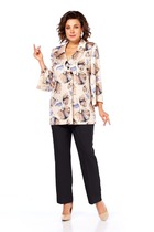 Костюм женский двухпредметный, состоящий из жакета и брюк. Жакет полуприлегающего силуэта с центральной бортовой застёжкой на одну петлю-пуговицу до линии перегиба лацкана. Перед с талиевой вытачкой и прорезным карманом с листочкой с втачными концами. Спинка со средним швом. Рукав втачной двухшовный длинный. Воротник пиджачного типа. Брюки классического кроя, слегка зауженные к низу с притачным поясом с резинкой по задним половинкам брюк. Брюки с наклонным к боковому шву карманом и двумя фигурными хлестиками на одну пуговицу по поясу передних половинок. Застёжка на тесьму - молнию и одну петлю-пуговицу по поясу. Низ брюк имеет фигурную форму - укорочена по передним половинкам и удлинённые по задним. Длина жакета по спинке - 59 см. Длина рукава - 61 см. Длина брюк по боковому шву - 96 см.