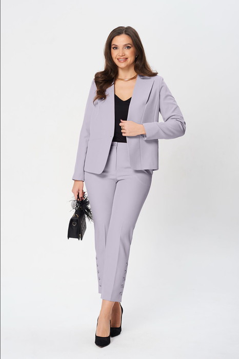 й двухпредметный, состоящий из жакета и брюк. Жакет полуприлегающего силуэта с центральной бортовой застёжкой на одну петлю-пуговицу. Перед с отрезным бочком и рельефным швом, идущим из плечевого шва и до низа. В области груди лацкан входит в рельефный шов. На деталях переда обработаны накладные карманы фигурной формы, расположенные в нижней части изделия между боковым швом и рельефом. Спинка со средним швом. Воротник пиджачного типа. Рукава втачные длинные двухшовные.