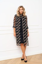 Жакет полуприлегающего силуэта, удлиненный, с центральной бортовой застежкой на 2 петли-пуговицы до линии перегиба лацкана. Перед с нагрудными вытачками, выходящими из горловины. Боковые швы с разрезами, между которыми по спинке вставлен пояс фигурной формы с декоратичной нашивкой. Спинка со средним швом. Воротник пиджачного типа. Рукава втачные двухшовные длиной 3/4.
