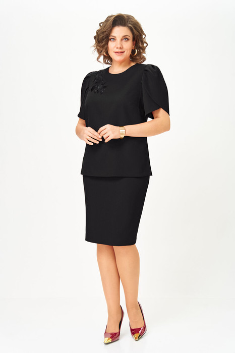 Костюм женский двухпредметный, состоящий из блузы и юбки. Блуза прямого силуэта, декорированная вышивкой, с нагрудными вытачками, выходящими из боковых швов, и с разрезами. Спинка со средним швом, в котором обработан разрез с навесной петлей и пуговицей. Горловина овальной формы. Рукава короткие фантазийной формы на запах со складками по окату. Рукав двойной, обтачен атласной тканью. Юбка-карандаш длиной до линии колена, с притачным поясом из атласа, на резинке между талиевыми вытачками. Заднее полотнище со средним швом, заканчивающимся шлицей. Застежка на одну петлю-пуговицу по поясу и тесьму-молнию в среднем шве.