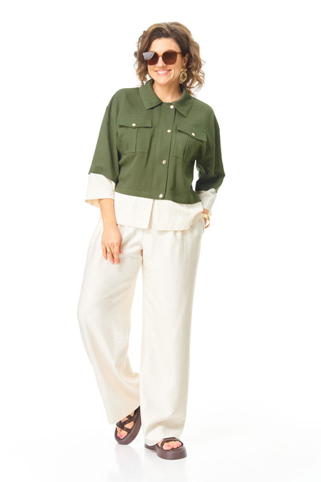 Жакет прямого свободного покроя со спущенной линией плеча. По переду обработана настрочная планка. Застежка центральная бортовая на золотые кнопки. По спинке и переду обработана отрезная баска контрастного цвета. Воротник блузочный отложной. Рукав длинной 3/4. По низу рукава обработана отрезная манжета контрастного цвета. По переду имеются накладные карманы с бантовыми складками и клапанами.