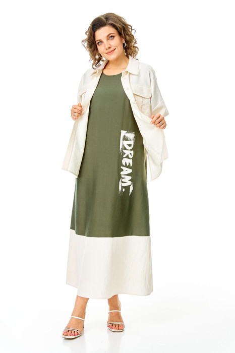 Платье женское А-образного силуэта с естественной линией плеча. Горловина округлой формы. В среднем шве спинки застежка на тесьму-молнию. Перед и спинка с отрезной нижней частью контрастного цвета. В боковых швах обработаны карманы. Рукав короткий одношовный. По переду нанесен авторский принт в цвет нижней части платья.