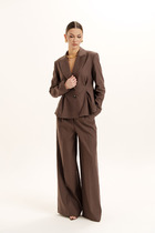 Брюки свободные прямого силуэта. Пояс притачной с резинкой по бокам. Передние половинки с карманами с отрезным бочком и односторонними складками. Застежка на тесьму-молнию и пуговицу.