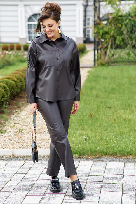 Рубашка— не просто верх, а главный акцент. Кожа, плотная, но податливая, образует «оверсайз» силуэт. Плечо, от места втачивания воротника и до вытачки по рукаву, украшены декоративными косичками из кожаных тесёмок. По переду рубашки застёжка на декоративные пуговицы в тон ткани по планке, и накладные карманы. Воротник рубашечного типа. Линия плеча спущенная. Спинка в рубашке с отрезной кокеткой. Рукав втачной, длинный с локтевым швом и разрезом от низа; заложенной складкой от низа и притачной манжетой. Низ в рубашке ассиметричный. Брюки прямого силуэта из кожи с рельефами и отстрочкой по переду. По переду застежка на тесьму молнию в гульфике и пуговицу в поясе. По переду брюк наклонные карманы. Пояс притачной со вставкой эластичной тесьмы резинки в «бочках», что обеспечивает комфортную посадку на фигуру.