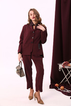 Данный костюм отлично подходит для торжественных мероприятий, свиданий, работы в офисе если дополнить его соответствующими аксессуарами и обувью Блузка свободного силуэта, с фигурной линией горловины по форме «лодочка»; по переду блузки нагрудные вытачки. По спинке блузки вырез капелька с застёжкой на пуговицу. Рукав втачной, длинный с фигурным вырезом, по низу рукава манжета с застёжкой на петли пуговицы. Брюки-кюлоты свободного силуэта, длиной 7/8 расширяются к низу. Пояс притачной со вставкой эластичной тесьмы-резинки, которая обеспечивает максимально удобную посадку на любой тип фигуры. По переду брюк от верха застрачиваются складки. В задней части брюк застёжка на тесьму-молнию в шве и пуговицу в поясе. В боковых швах брюк - карманы. Длина блузки от высшей точки плечевого шва до низа 60 см (р 50-54), 61 см (р 56-60). Длина рукава 61 см (р 50-54), 62 см (р 56-60). Длина брюк по боковому шву от шва притачивания пояса 93 см (р 50-54), 94 см (р 56-60).