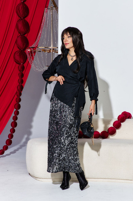 Потрясающий юбочный комплект, состоящий из блузки и юбки, который подарит вам ощущение праздника и непринуждённости. Ассиметричный  крой блузы отлично гармонирует  с ярким в пайетки низом, создавая тем самым идеальный  комплект. Блуза  прямого силуэта с запахом на поясе завязке  с декоративным элементом в виде вышивки на какетке  спинки. Горловина V-образная, воротник рубашечный с дизайнерским решением. С фигурными рельефами по переду и ассиметричным низом. Спинка блузки с рельефом и с запахом внизу. Рукав втачной одношовный по низу со сборкой и манжетом с завязкой. Юбка прямого силуэта. Пояс цельновыкроенный с эластичной тесьмой, что обеспечивает максимально комфортную посадку на любой тип фигуры. Юбка на трикотажной подкладке, по низу со внутренней стороны обтачка из подкладочной ткани для максимального удобства. Длина блузы по спинке 71 см. Длина рукава 50 см. Длина юбки 96 см.
