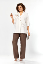 Костюм женский из плотного гладкокрашеного трикотажного полотна "кулирка", состоящий из футболки и шорт. Футболка - свободного покроя, с удлиненными плечевым и швами, короткими втачными рукавами и горловиной овальной формы, обработанной втачной планкой. В нижней части переда слева настрочен декоративный элемент прямоугольной формы. По горловине проложена отделочная строчка. Шорты - классического покроя, на притачном поясе с эластичной тесьмой внутри и карманами в боковых швах. Для регулирования степени прилегания шорт по талии в пояс вставлен шнурок, продетый через два отверстия в соединительных швах в центре пояса.