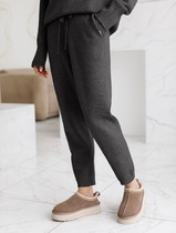 Костюм женский из трикотажного полотна "кулирка" в комбинации двух видов: гладкокрашенного и с рисунком в крупную клетку, сочетающихся между собой по цвету, состоящий из джемпера и брюк. Джемпер - из гладкокрашеного полотна, свободного покроя, с длинными втачными рукавами и приспущенными плечами, с горловиной овальной формы и тематическим принтом, выполненным в технике шелкографии. Горловина, нижние срезы рукавов и низ изделия обработаны подгибкой с отделочным широким кантом контрастного цвета. Брюки - из полотна в клетку, свободного покроя, прямые, на притачном поясе с эластичной тесьмой внутри, с карманами в боковых швах. Нижние срезы обработаны подгибкой.