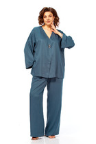 Пижама молодежная из гладкокрашенного трикотажного полотна «кашкорсе», состоящая из футболки и брюк. Футболка – прилегающего силуэта, с V-образным вырезом горловины, короткими втачными рукавами, выполненными из кружева. По всей длине вырез горловины переда отделан кружевной вставкой.