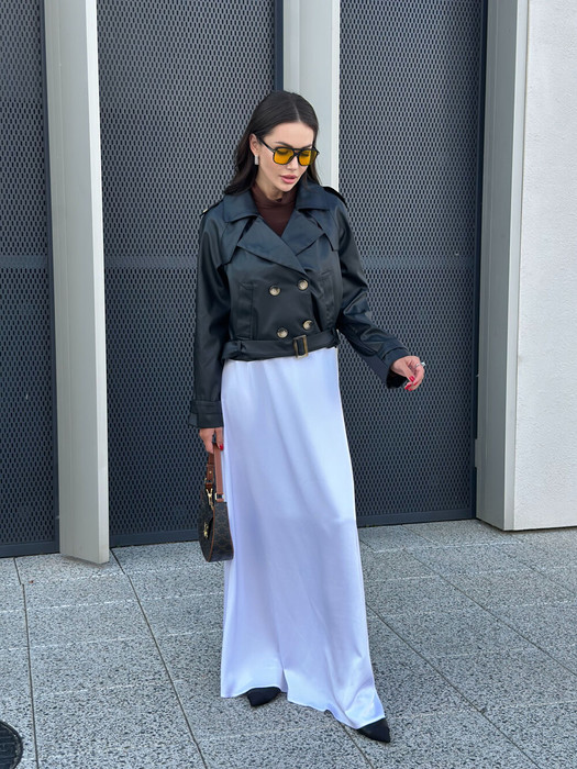 Тренч укороченный, на подкладке. Рукав прямой, длинный, реглан. По переду обработаны втачные карманы. Паты обработаны по плечевым швам и на манжетах. Паты пришиты на пуговицы. По низу тренча обработаны шлёвки и съёмный пояс. Застёжка - 2 ряда пуговиц по центру переда.