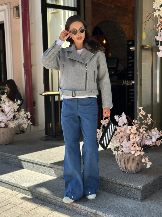 Куртка укороченная, на подкладке, выполнена из плотной пальтовой ткани. Плечевой шов спущен, рукав прямой, по низу рукавов обработаны молнии. Рукав стачной. Застёжка - разъёмная молния, по передним половинкам обработаны молнии. Низ изделия обработан шлёвками, поясом из основном ткани