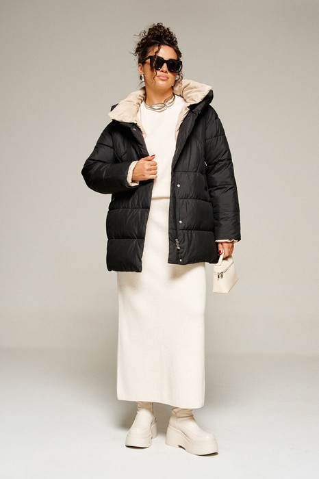 Застежка центральная на двустороннюю молнию от уровня груди до низа и кнопки по краю борта.