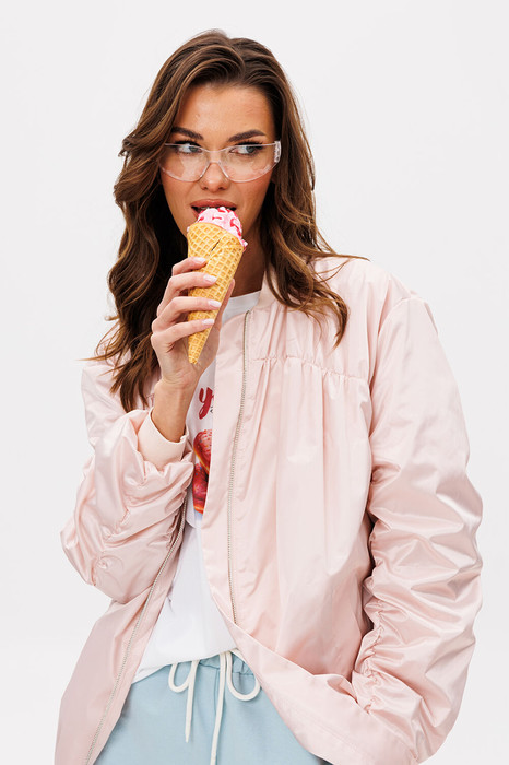 Куртка удлиненная со спущенной линей плеча. Рукав втачной двухшовный со сборкой по швам, внизу рукав на манжете из довяза. Полочка с центральной застежкой на тесьму-молнию и кокеткой со сборкой по шву и карманом с листочкой. Спинка с кокеткой со сборкой по шву. По горловине и низу куртки планка из довяза. Куртка на подкладке.