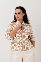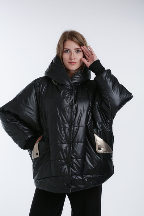 Куртка женская со смещенной застежкой на кнопки, с ццельнокроенным рукавом. По спинке средний шов, втачная центральная часть со стежкой, по низу застрочены вытачки. По переду рельефные швы, центральная часть со стежкой, накладные карманы в рельефах. Цельнокроенный капюшон с отрезной боковой частью. По низу рукава притачной манжет из трикотажа-довяза. Используется две ткани.