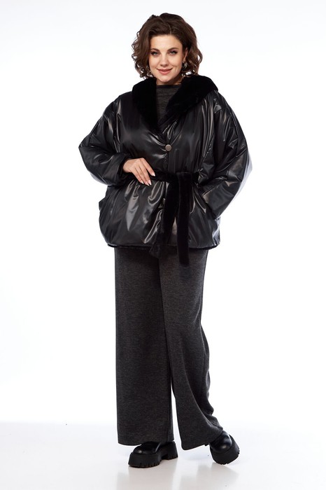 Куртка женская 2-ух сторонняя, свободного кроя с застежкой на 3 навесные петли и пуговицы, одна сторона из искуственного меха, другая из плащевки. Спинка с рельефами от плеча до бокового шва с петлями в области талии для пояса. Перед с рельефами от плеча до бокового шва, в которых обработаны петли для пояса и боковые карманы. Воротник-капюшон цельнокроенный с передом. Отлетный пояс просовывается в петли рельефов, пропуская бока. Рукава цельнокроенные с воможностью отвернуть манжеты. Куртка с утеплителем синтепон 60.