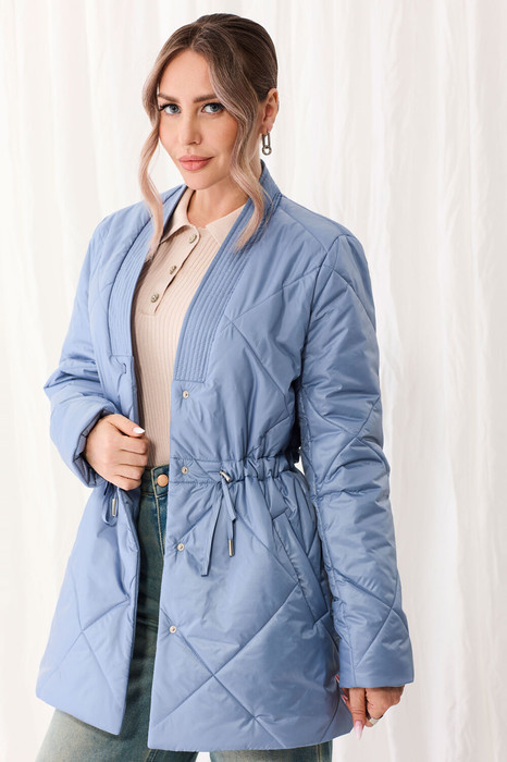 Куртка утепленная, с центральной застежкой на кнопки, втачным воротником, V-образным вырезом горловины. На полочках расположены прорезные карманы с листочками. На линии талии расположена кулиса со шнуром. Толщина синтепона 150г/м2, , изделие рекомендуется до -5 градусов.