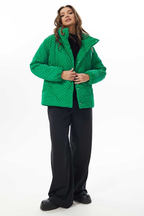 Куртка женская утеплённая осень-зима, прямого силуэта, со спущенными плечами, выполнено из ткани лаке на утеплителе изософт. По переду прорезные карманы с листочкой и застёжка на 7 кнопок. Воротник стойка. Рукава одно шовные втачные. Низ рукавов собран на эластичную тесьму резинку. Подкладка простёгана с утеплителем изософт