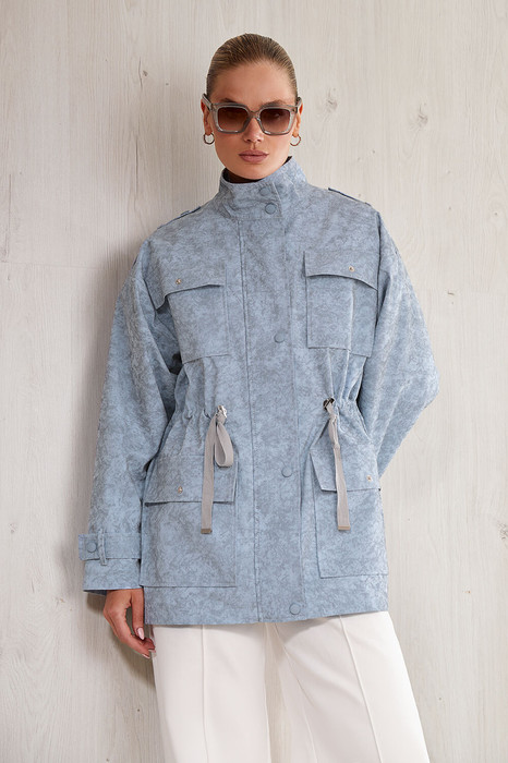 Куртка прямого силуэта, длиной ниже линии бедра. Центральная бортовая застежка на молнию и дополнительно изделие застегивается на кнопки. На полочке накладные карманы с клапанами. Спинка прямая с отрезной кокеткой. По талии выполнена кулиса, в которую вставлена резинка, для регулировки изделия по фигуре и декоративные шнурки. Спущенная линия плеча. Длинный прямой рукав с декоративными патами. По линии плеча вставлена декоративная пата. Воротник - высокая стойка.