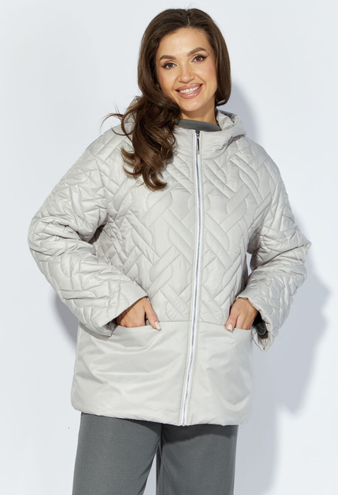 Куртка женская, прямого силуэта с длинным рукавом. Рукав со спущенной линией плеча. Длина рукава может регулироваться отложной цельнокроеной манжетой. Горловина оформлена капюшоном со стойкой. Застежка цельнокроеная на "молнию" Ниже линии талии по переду и спинке горизонтальный подрез. Спереди в подрезе карманы. Вход в карман оформлен потайной "молнией" Отрезная деталь спинки акцентирована вышивкой.