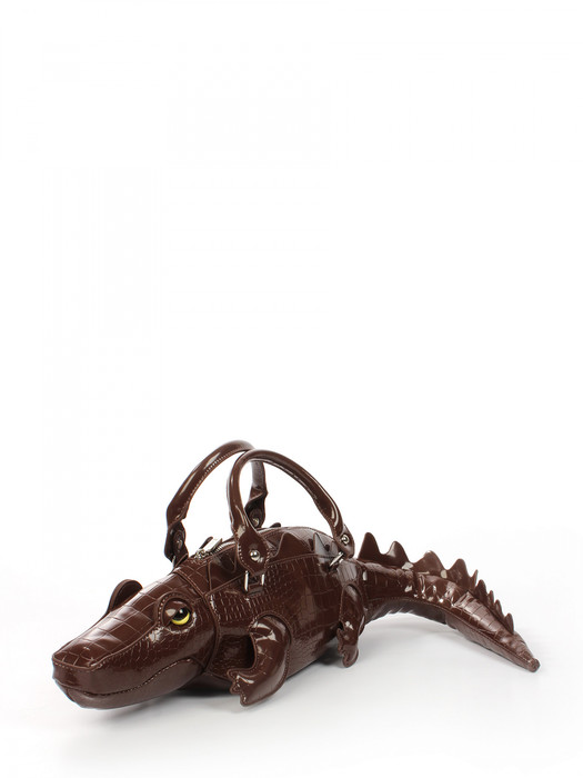 Сумка в виде крокодила выполнена из экокожи. Детали: 2 короткие ручки 30 см, 1 отстегивающаяся ручка от 110 см до 125 см. Внутри изделия: 1 отделение на молнии. Брендированная подкладка из хлопка. Металлическая брендированная фурнитура серебристого цвета. В комплекте фирменный пыльник для хранения сумки.